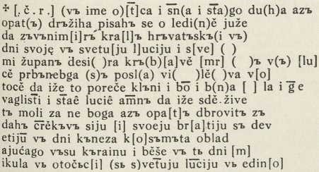 <znak> 1100. U ime Oca i Sina i Svetoga Duha. Ja opat Držiha pisah ovo o ledini, koju dade Zvonimir, kralj hrvatski, u svoje dane svetoj Luciji; i svjedok (ili svjedoci) mi župan Desi?ra (Desila?) Krbavi, .....(župan?) u Luci Pribinega (ili Prvaneg); ovaj posla Vitoslava na otok, da tko to poreče, neka ga prokune Bog i blažena Roditeljnica (t. j. Bogorodica) i 4 evanđelista i sveta Lucija, amen; da tko ovdje živi moli za njih Boga. — Ja opat Dobrovit sazidah ovu crkvu sa svoje devetero braće (t. j. redovnika) u dane kneza Kozmata (Kuzme), koji je vladao svom krajinom. A bijaše u te dane (sveti) Mikula u Otočcu sa svetom Lucijom zajedno.